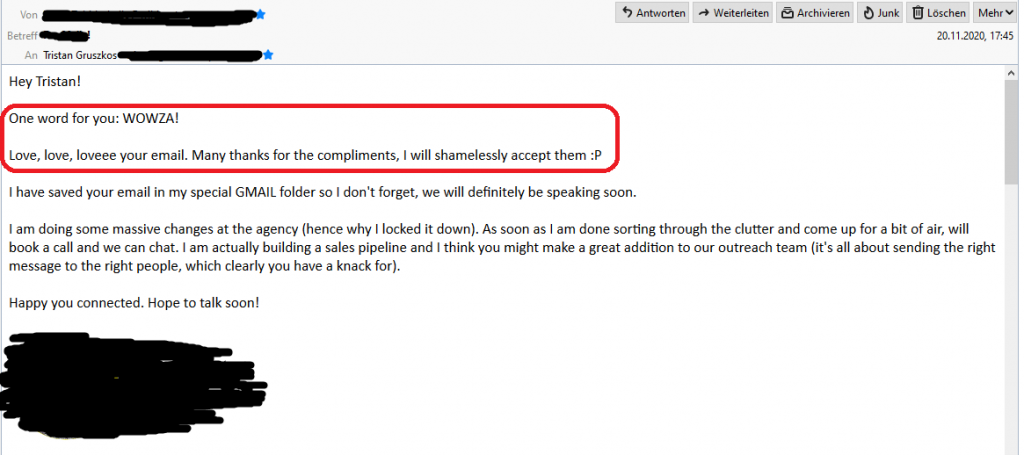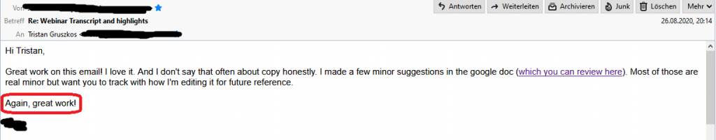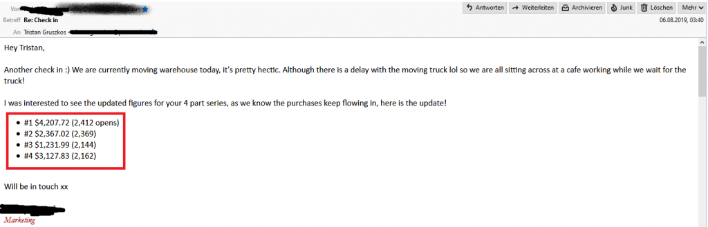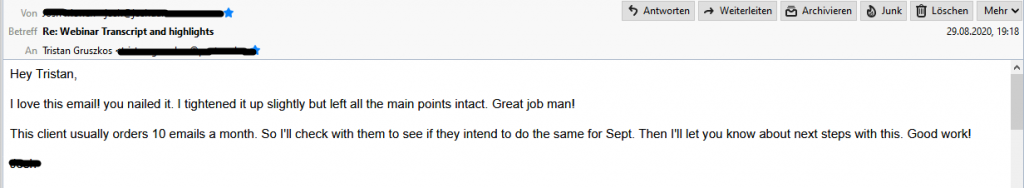 - Den exakten Funnelaufbau inklusive der E-Mail-Struktur, für die sich unsere Leser und Bewerber danach bedankt haben (ja, bedankt – Beweise gibt’s in der Case Study)