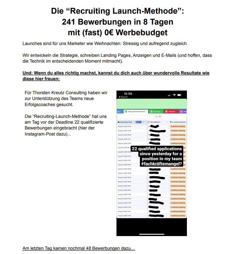 Willst du mal den exakten Funnel inklusive E-Mails und Landing Pages sehen, die uns im Team Thorsten Kreutz 241 neue Bewerbungen in 8 Tagen eingespielt haben…?